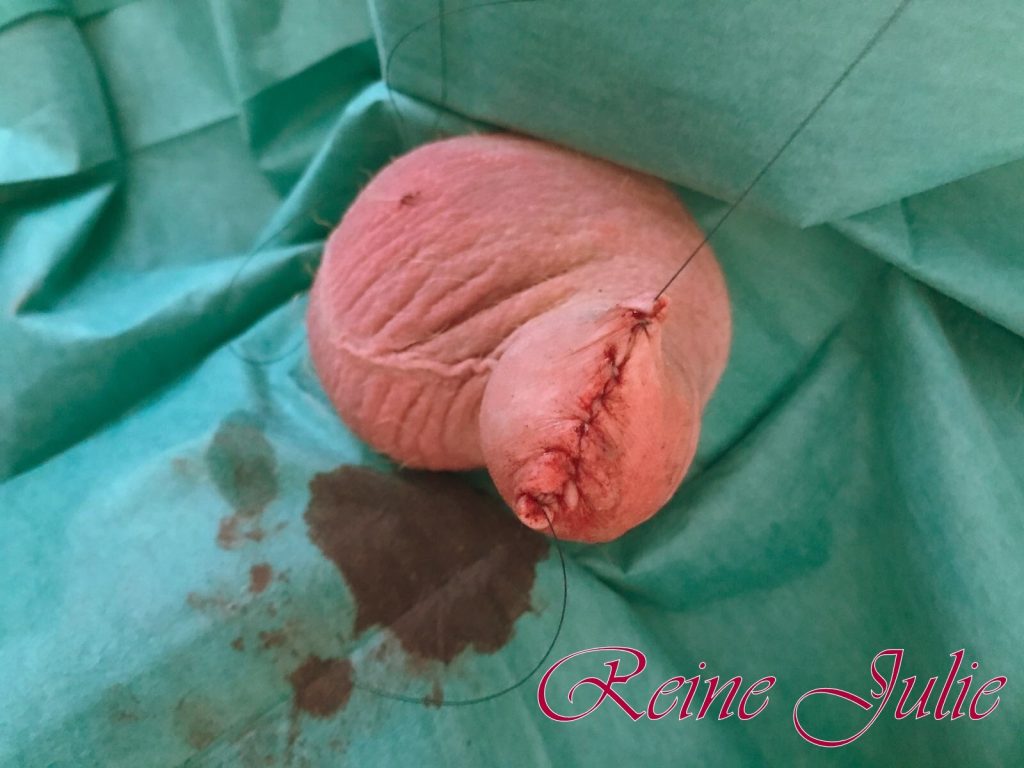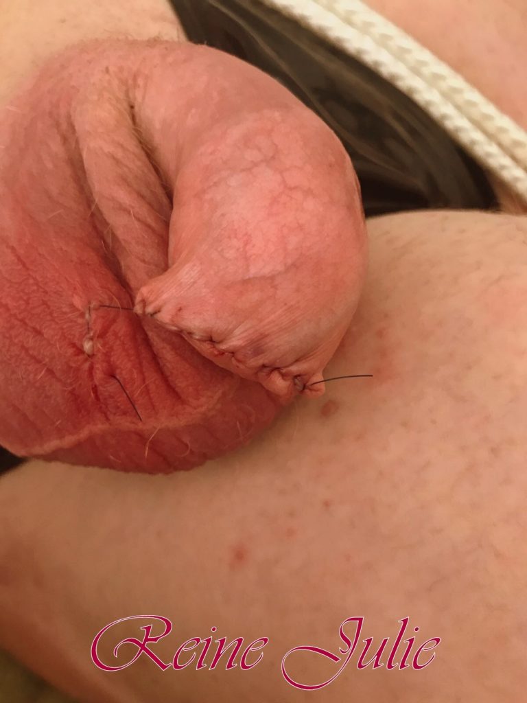 Entre deux points de suture, j’essayais de trouver une position plus confortable. Je me relevais comme je pouvais mais mes liens se serraient de plus en plus. La situation Ă©tait inadĂ©quate et faisait rire ma Reine ! La tĂȘte en l’air m’allait mieux pour respirer. Ma reine continuait ses travaux de couture et trĂšs rapidement elle me cousut entiĂšrement le bout de mon clito. Ma peau Ă©tirĂ©e Ă©tait complĂštement cousu par un certain nombre de points. Mon gland est alors complĂštement enfermĂ©, juste impressionnant ! Elle rejoignait ensuite le bout aux testicules en serrant le fil. Elle terminait rapidement le travail. Sensation bizarre de se sentir enfermĂ©e de la sorte. Quelques gouttes de sang, rien de grave et ma reine me dĂ©tache de mes liens. Quelques photos souvenirs d’une opĂ©ration, plus de peur que de douleur.